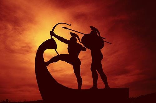 Among those who were convinced was the father of the then-teenage Pericles, Xanthippos. A wealthy aristocrat, a well-known politician, and a brave soldier, the myth goes that Xanthippos arrived at Piraeus with his family to be transported with other Athenians to Salamis. However, his loyal dog followed him there but never boarded either because there were too many people and little space, or because someone threw him off the trireme, and thus he remained on the shore.