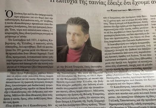 Δεν ήταν άγιος όμως ο Καποδίστριας, όπως δεν ήταν άγιος και κανένας πρωταγωνιστής σημαντικής ιστορικής περιόδου. Ούτε ο Κολοκοτρώνης, ούτε ο Τρικούπης, ούτε ο Βενιζέλος, ούτε κανένας άλλος. Η επιτυχία της ταινίας έδειξε ότι έχουμε ανάγκη από ταινίες σαν κι αυτή. Καλύτερες ίσως ταινίες, με ευρηματικότερο σενάριο και πλουσιότερη παραγωγή. Ταινίες που θα ξεκινούν τη συζήτηση για ιστορικές περιόδους και διχαστικά γεγονότα που μας στοιχειώνουν και τελικά μας διαμορφώνουν. Όπως έδειξε και ότι έχουμε ανάγκη από ηγέτες, μα όχι από Μεσσίες. Ηγέτες που θα λειτουργούν σε μια ώριμη και δημοκρατικά χορτασμένη πια Ευρώπη, που αποτελεί πρότυπο σε όλα τα μήκη και τα πλάτη του κόσμου.”