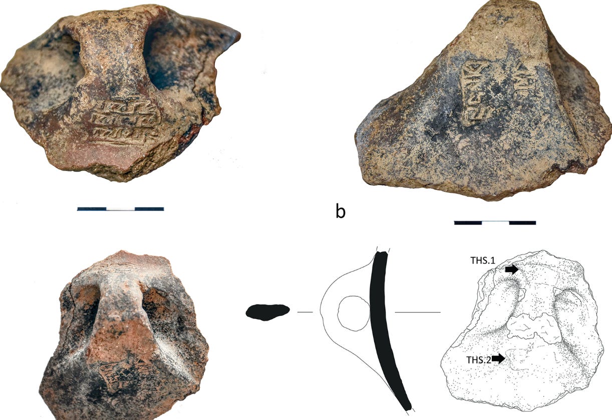 “These are two seal impressions on the handle of a vessel, originating from a room in the settlement dated to the middle of the 3rd millennium BCE (Early Cycladic II period). The first seal impression (THS.1), located on the upper part of the handle, comes from a three-sided seal with elongated surfaces, decorated with a series of abstract and schematic symbols arranged in a juxtaposed sequence. These successive marks, placed in a coherent order, constitute the earliest testimony of developments connected to the emergence of writing in the Aegean region. The second seal impression (THS.2), featuring linear and meander decorative motifs, falls within the broader tradition of Aegean glyptic art.”